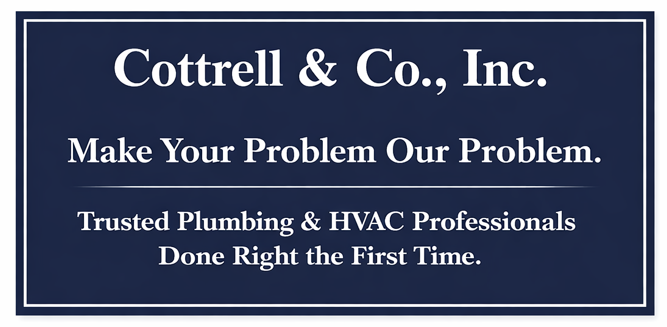 Cottrell provides comprehensive residential and commercial plumbing, heating, and air conditioning services including drain cleaning, water heaters, toilets, water & sewer lines, gas lines, slab leaks, garbage disposals, heater/AC repair and installation, ductwork, thermostats & zoning, home air purification systems, and preventative maintenance.